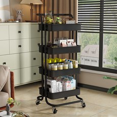 9YOUNG 4단 핸드 트롤리 다용도 수납용 카트 이동식 수납함, 블랙