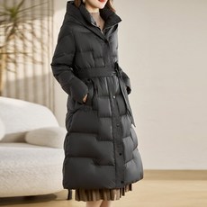 POMTOR 여성 고급 오리털 후드 롱패딩 겨울 벨트 자켓 점퍼