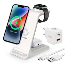 뷰씨 3in1 고속 무선 충전기 거치대 애플워치 갤럭시 워치 호환 25w 초고속 충전기 포함, 화이트